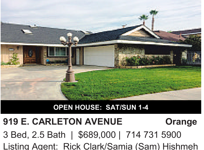 919 E. CARLETON AVENUE Orange 3 Bed, 2.5 Bath | $689,000 | 714 731 5900 Listing Agent: Rick Clark/Samia (Sam) Hishmeh