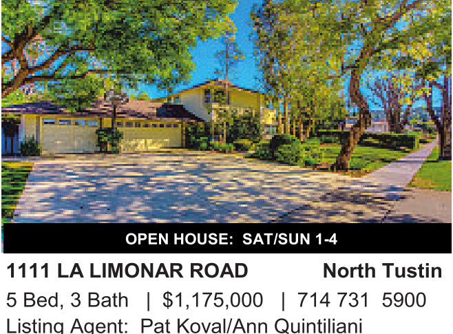 1111 LA LIMONAR ROAD North Tustin 5 Bed, 3 Bath | $1,175,000 | 714 731 5900 Listing Agent: Pat Koval/Ann Quintiliani