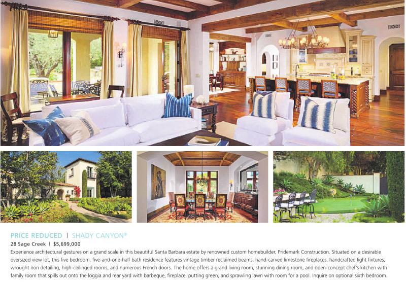 PRICE REDUCED | SHADY CANYON ® 28 Sage Creek | $5,699,000 Experience architectural gestures on a grand scale in this beautiful Santa Barbara estate by renowned custom homebuilder, Pridemark Construction. Situated on a desirable oversized view lot, this five bedroom, five-and-one-half bath residence features vintage timber reclaimed beams, hand-carved limestone fireplaces, handcrafted light fixtures, wrought iron detailing, high-ceilinged rooms, and numerous French doors. The home offers a grand living room, stunning dining room, and open-concept chef’s kitchen with family room that spills out onto the loggia and rear yard with barbeque, fireplace, putting green, and sprawling lawn with room for a pool. Inquire on optional sixth bedroom.