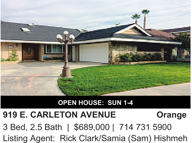 919 E. CARLETON AVENUE Orange 3 Bed, 2.5 Bath | $689,000 | 714 731 5900 Listing Agent: Rick Clark/Samia (Sam) Hishmeh