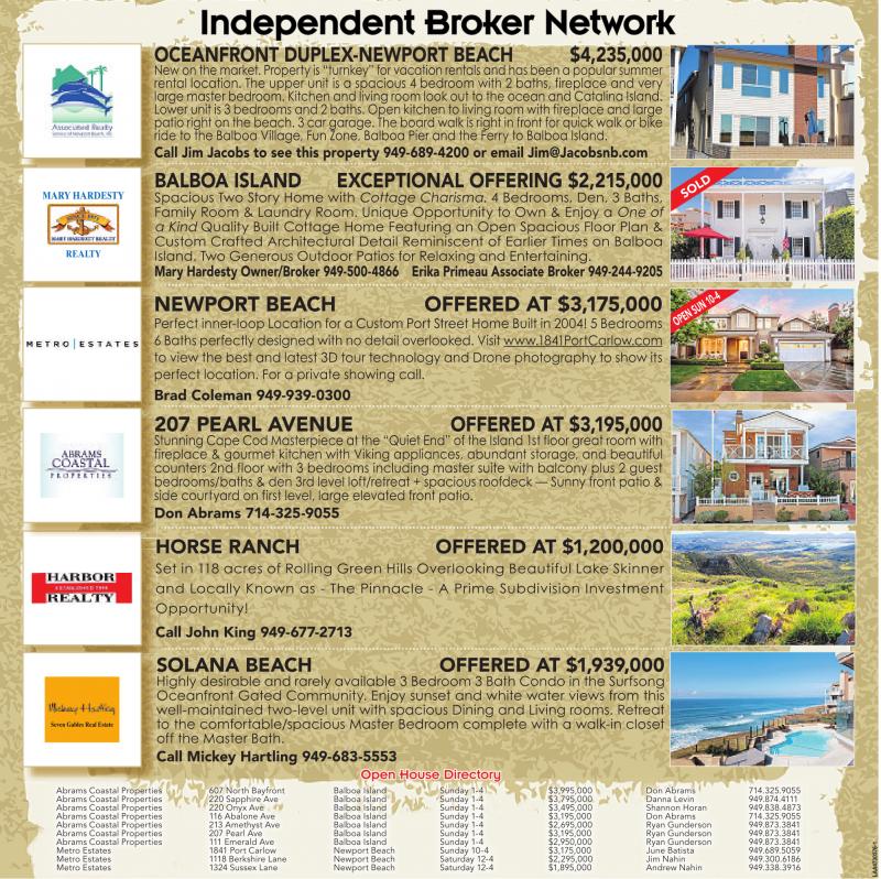 Abrams Coastal Properties 607 North Bayfront Balboa Island Sunday 1-4 $3,995,000 Don Abrams 714.325.9055 Abrams Coastal Properties 220 Sapphire Ave Balboa Island Sunday 1-4 $3,795,000 Danna Levin 949.874.4111 Abrams Coastal Properties 220 Onyx Ave Balboa Island Sunday 1-4 $3,495,000 Shannon Horan 949.838.4873 Abrams Coastal Properties 116 Abalone Ave Balboa Island Sunday 1-4 $3,195,000 Don Abrams 714.325.9055 Abrams Coastal Properties 213 Amethyst Ave Balboa Island Sunday 1-4 $2,695,000 Ryan Gunderson 949.873.3841 Abrams Coastal Properties 207 Pearl Ave Balboa Island Sunday 1-4 $3,195,000 Ryan Gunderson 949.873.3841 Abrams Coastal Properties 111 Emerald Ave Balboa Island Sunday 1-4 $2,950,000 Ryan Gunderson 949.873.3841 Metro Estates 1841 Port Carlow Newport Beach Sunday 10-4 $3,175,000 June Batista 949.689.5059 Metro Estates 1118Berkshire Lane Newport Beach Saturday 12-4 $2,295,000 Jim Nahin 949.300.6186 Metro Estates 1324 Sussex Lane Newport Beach Saturday 12-4 $1,895,000 Andrew Nahin 949.338.3916