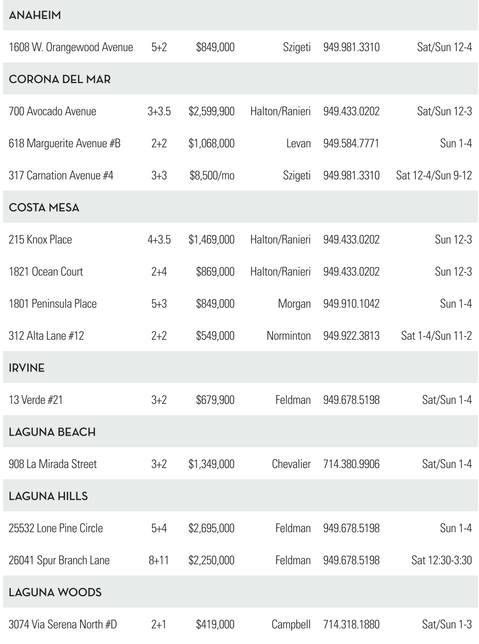ANAHEIM 1608 W. Orangewood Avenue 5+2 $849,000 Szigeti 949.981.3310 Sat/Sun 12-4 CORONA DEL MAR 700 Avocado Avenue 3+3.5 $2,599,900 Halton/Ranieri 949.433.0202 Sat/Sun 12-3 618 Marguerite Avenue #B 2+2 $1,068,000 Levan 949.584.7771 Sun 1-4 317 Carnation Avenue #4 3+3 $8,500/mo Szigeti 949.981.3310 Sat 12-4/Sun 9-12