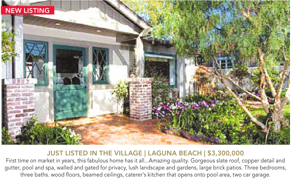 NEW LISTING JUST LISTED IN THE VILLAGE | LAGUNA BEACH | $3,300,000 First time on market inyears, this fabulous home has it all...Amazing quality. Gorgeous slate roof, copper detail and gutter, pool and spa, walled and gated for privacy, lush landscape and gardens, large brick patios. Three bedrooms, three baths. wood floors, beamed ceilings, caterer’s kitchen that opens onto pool area, two car garage. See also