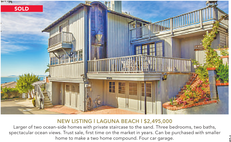 NEW LISTING l LAGUNA BEACH l $2,495,000 Larger of two ocean-side homes with private staircase tothe sand. Three bedrooms, two baths,