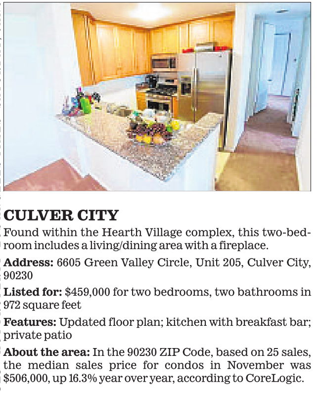 About the area: In the 90230 ZIP Code, based on 25 sales, the median sales price for condos in November was $506,000, up 16.3% year over year, according to CoreLogic.