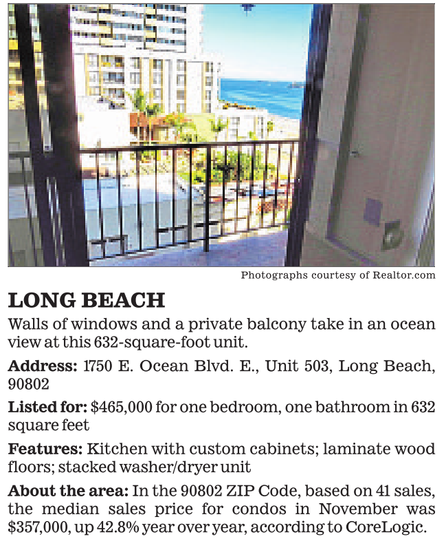Photographs courtesy of Realtor.com LONG BEACH Walls of windows and a private balcony take in an ocean view at this 632-square-foot unit. Address: 1750 E. Ocean Blvd. E., Unit 503, Long Beach, 90802 Listed for: $465,000 for one bedroom, one bathroom in 632 square feet Features: Kitchen with custom cabinets; laminate wood floors; stacked washer/dryer unit About the area: In the 90802 ZIP Code, based on 41 sales, the median sales price for condos in November was $357,000, up 42.8% year over year, according to CoreLogic.