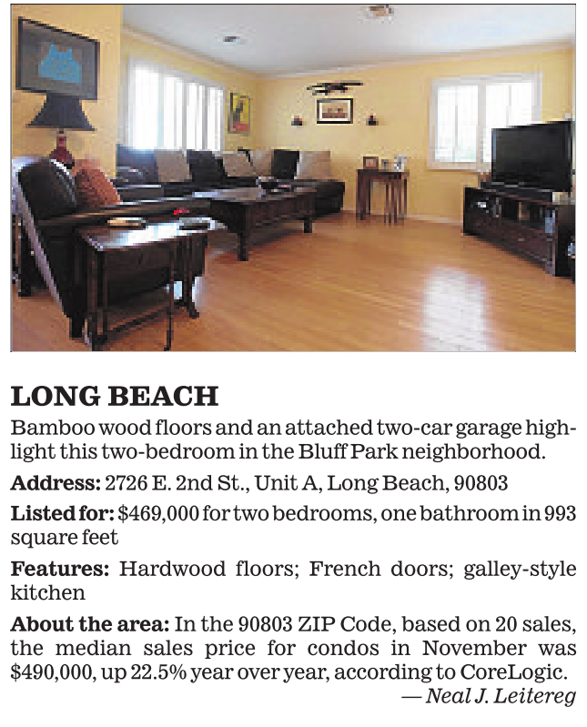 About the area: In the 90803 ZIP Code, based on 20 sales, the median sales price for condos in November was $490,000, up 22.5% year over year, according to CoreLogic.