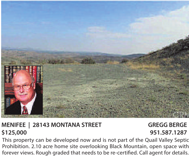 MENIFEE | 28143 MONTANA STREET GREGG BERGE $125,000 951.587.1287 This property can be developed now and is not part of the Quail Valley Septic Prohibition. 2.10 acre home site overlooking Black Mountain, open space with foreverviews. Rough graded that needs tobere-certified.Call agent for details.