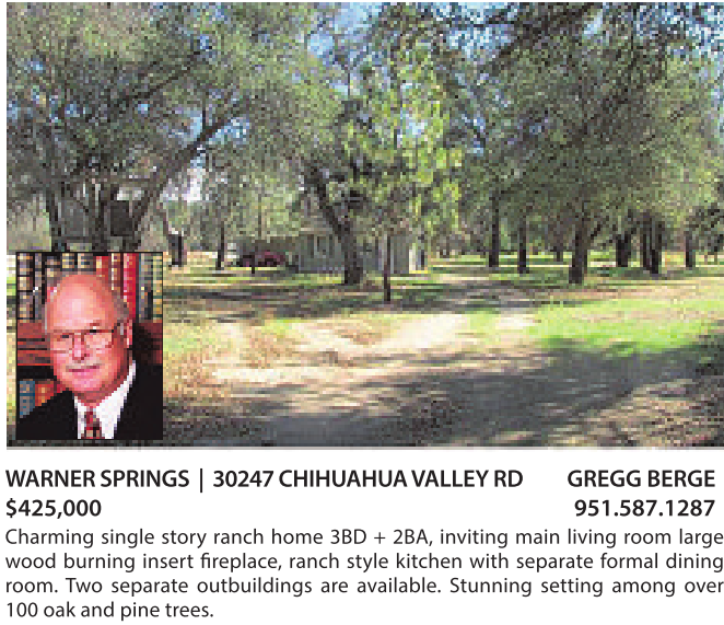 WARNER SPRINGS | 30247 CHIHUAHUAVALLEY RD GREGGBERGE $425,000 951.587.1287 Charming single story ranch home 3BD + 2BA, inviting main living room large wood burning insert fireplace, ranch style kitchen with separate formal dining room. Two separate outbuildings are available. Stunning setting among over 100 oak and pine trees.
