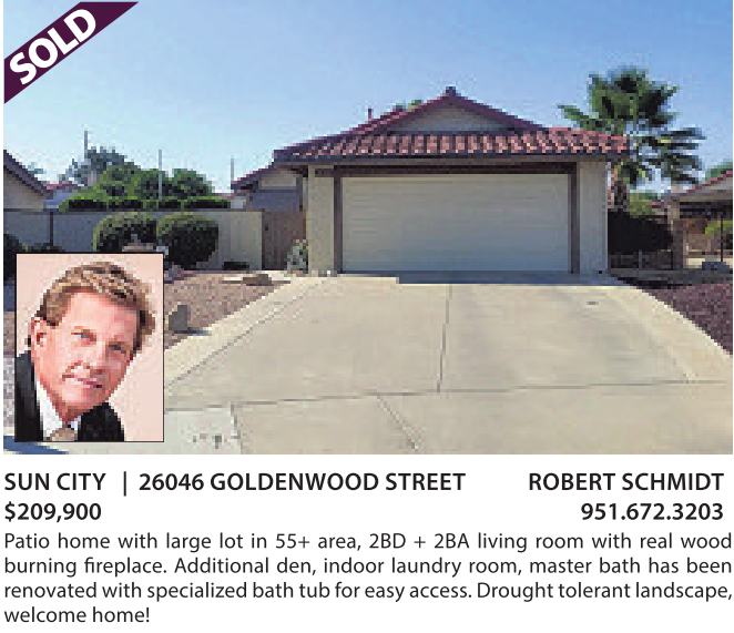 $209,900 951.672.3203 Patio home with large lot in 55+ area, 2BD + 2BA living room with real wood burning fireplace. Additional den, indoor laundry room, master bath has been