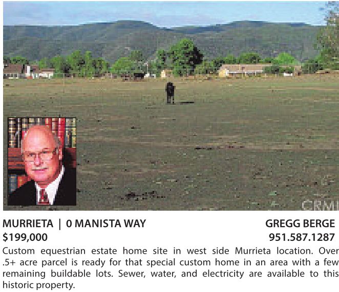 MURRIETA | 0MANISTAWAY GREGG BERGE $199,000 951.587.1287 Custom equestrian estate home site in west side Murrieta location. Over .5+ acre parcel is ready for that special custom home in an area with a few remaining buildable lots. Sewer, water, and electricity are available to this historic property.