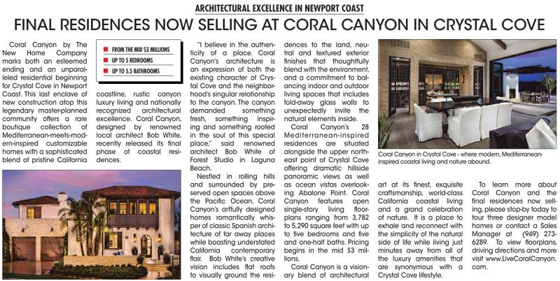 FINAL RESIDENCES NOW SELLING AT CORAL CANYON IN CRYSTAL COVE