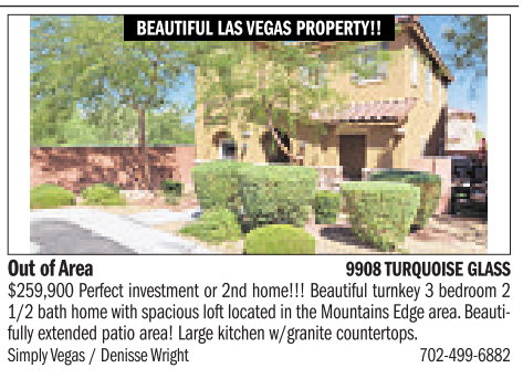 BEAUTIFUL LAS VEGAS PROPERTY!! Out of Area 9908 TURQUOISE GLASS $259,900 Perfect investment or 2nd home!!! Beautiful turnkey3bedroom 2 1/2 bath home with spacious loft located in the Mountains Edge area. Beautifully extended patio area! Large kitchen w/granite countertops. SimplyVegas /Denisse Wright 702-499-6882