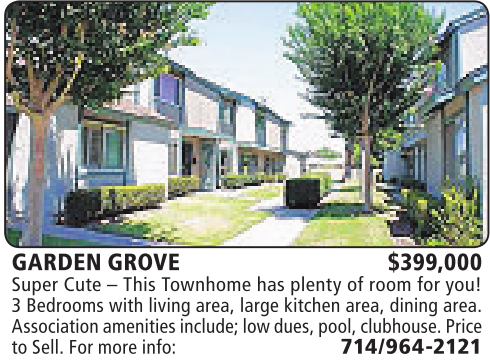 GARDEN GROVE $399,000 Super Cute – This Townhome has plenty of room for you! 3Bedrooms with living area, large kitchen area, dining area. Association amenities include;low dues,pool, clubhouse.Price to Sell.For more info: 714/964-2121