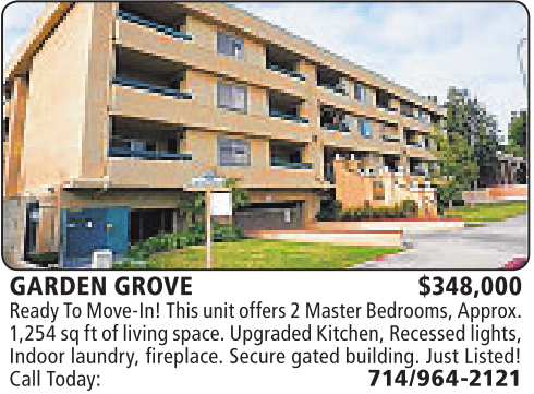 GARDEN GROVE $348,000 ReadyToMove-In! This unit offers2MasterBedrooms,Approx. 1,254sqftofliving space. Upgraded Kitchen, Recessedlights, Indoor laundry, fireplace. Secure gated building. Just Listed! Call Today: 714/964-2121