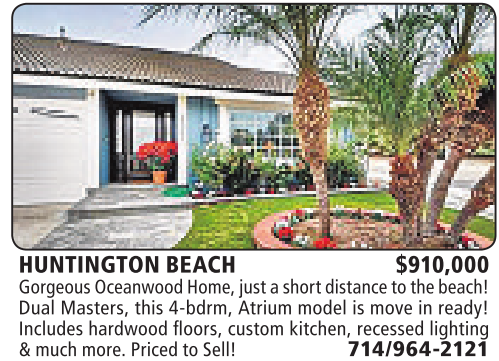 HUNTINGTON BEACH $910,000 Gorgeous Oceanwood Home,just ashortdistancetothe beach! Dual Masters, this 4-bdrm, Atrium model ismove in ready! Includes hardwood floors, custom kitchen, recessed lighting &much more.PricedtoSell! 714/964-2121