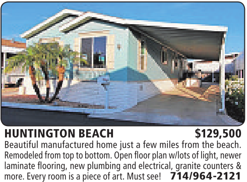 HUNTINGTON BEACH $129,500 Beautiful manufactured home just afew miles from the beach. Remodeledfrom top to bottom. Open floorplanw/lotsoflight,newer laminate flooring, new plumbing and electrical, granite counters & more.Every room is apiece of art. Mustsee! 714/964-2121