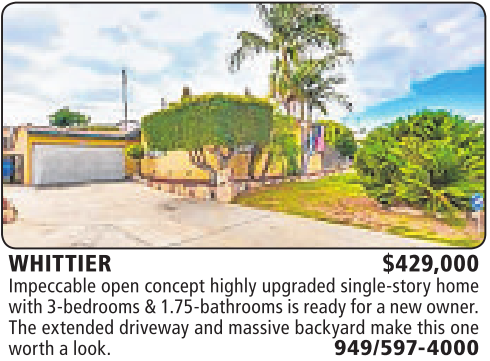 WHITTIER $429,000 Impeccable open concept highly upgraded single-story home with 3-bedrooms&1.75-bathrooms is readyfor anew owner. The extended driveway and massive backyard make this one worthalook. 949/597-4000