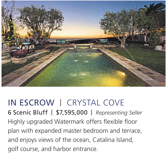 IN ESCROW | CRYSTAL COVE 6 Scenic Bluff | $7,595,000 | Representing Seller Highly upgraded Watermark offers flexible floor plan with expanded master bedroom and terrace, and enjoys views of the ocean, Catalina Island, golf course, and harbor entrance. See also