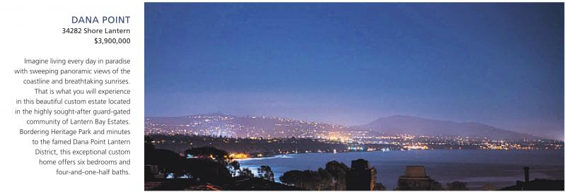 DANA POINT 34282 Shore Lantern $3,900,000 Imagine living every day in paradise with sweeping panoramic views of the coastline and breathtaking sunrises. That is what you will experience in this beautiful custom estate located in the highly sought-after guard-gated community of Lantern Bay Estates. Bordering Heritage Park and minutes to the famed Dana Point Lantern District, this exceptional custom home offers six bedrooms and four-and-one-half baths.