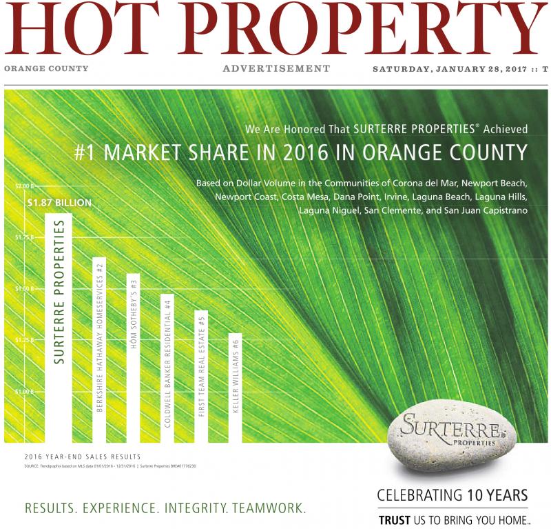 SATURDAY, JANUARY 28, 2017 :: T We Are Honored That SURTERRE PROPERTIES ® Achieved #1 MARKET SHARE IN 2016 IN ORANGE COUNTY $2.00 B $1.87 BILLION Based on Dollar Volume in the Communities of Corona del Mar, Newport Beach, Newport Coast, Costa Mesa, Dana Point, Irvine, Laguna Beach, Laguna Hills, Laguna Niguel, San Clemente, and San Juan Capistrano $1.75 B $1.50 B $1.25 B $1.00 B 2016 YEAR-END SALES RESULTS SOURCE: Trendgraphix based on MLS data 01/01/2016 -12/31/2016 | Surterre Properties BRE#01778230 RESULTS. EXPERIENCE. INTEGRITY. TEAMWORK. CELEBRATING 10 YEARS