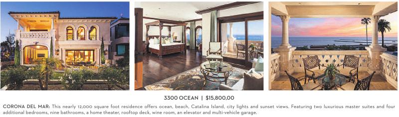 3300 OCEAN | $15,800,00 CORONA DEL MAR: This nearly 12,000 square foot residence offers ocean, beach, Catalina Island, city lights and sunset views. Featuring two luxurious master suites and four additional bedrooms, nine bathrooms, a home theater, rooftop deck, wine room, an elevator and multi-vehicle garage.