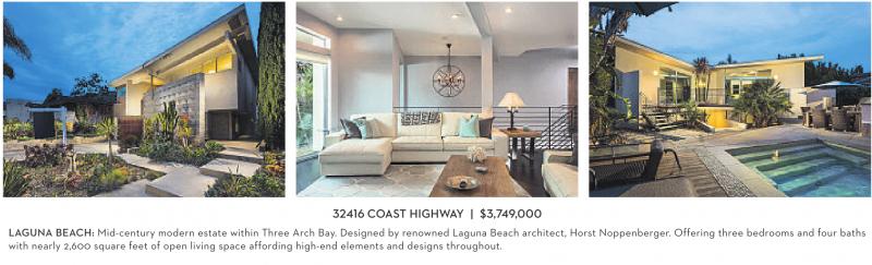 32416 COAST HIGHWAY | $3,749,000 LAGUNA BEACH: Mid-century modern estate within Three Arch Bay. Designed by renowned Laguna Beach architect, Horst Noppenberger. Offering three bedrooms and four baths with nearly 2,600 square feet of open living space affording high-end elements and designs throughout.