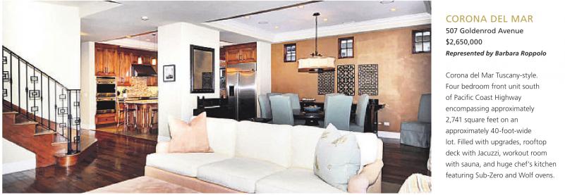 CORONA DEL MAR 507 Goldenrod Avenue $2,650,000 Represented by Barbara Roppolo Corona del Mar Tuscany-style. Four bedroom front unit south of Pacific Coast Highway encompassing approximately 2,741 square feet on an approximately 40-foot-wide lot. Filled with upgrades, rooftop deck with Jacuzzi, workout room with sauna, and huge chef’s kitchen featuring Sub-Zero and Wolf ovens.