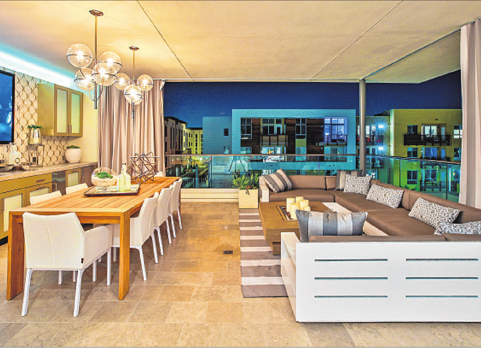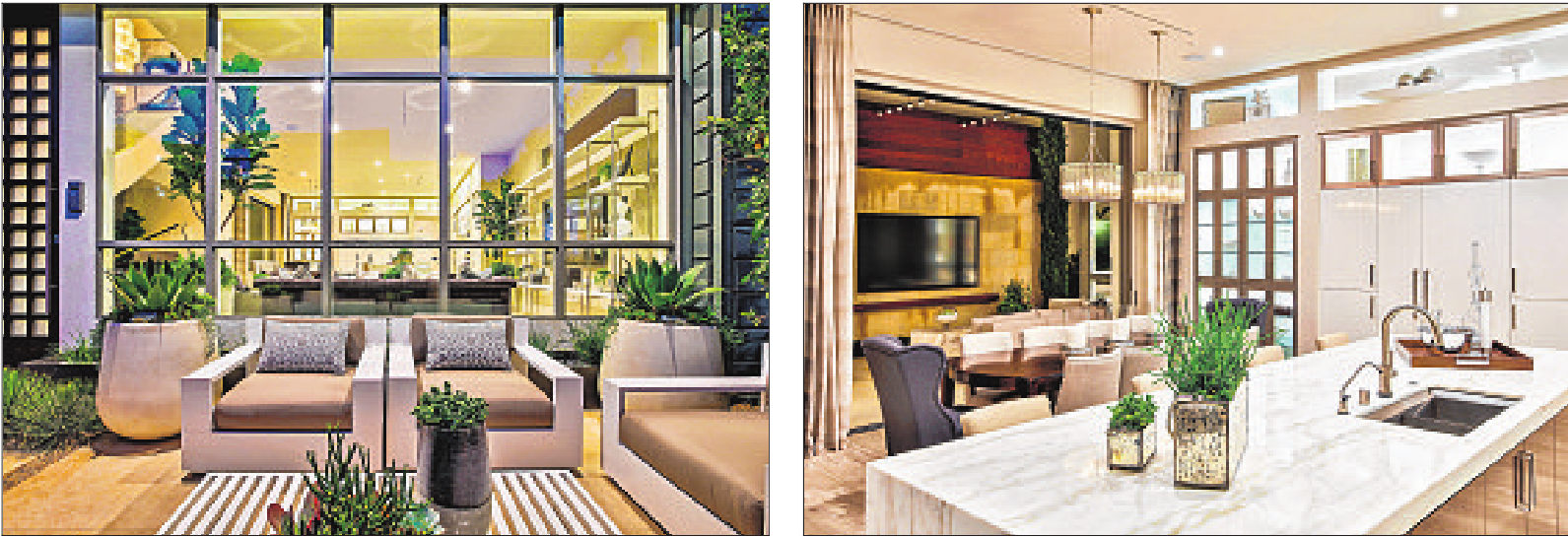 On the main floor, pocketing glass doors slide to reveal an outdoor theater and built-in barbecue. The top level of the threestory house features its own lounge area and bar that opens to acovered patio.