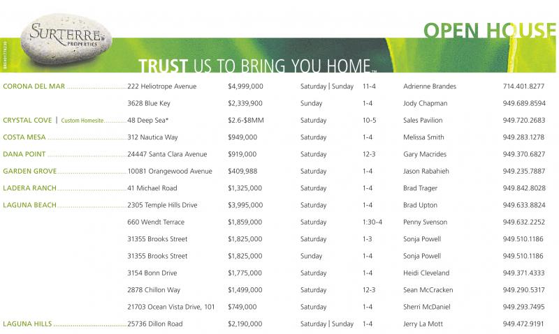CORONA DEL MAR ...............................222 Heliotrope Avenue $4,999,000 Saturday | Sunday 11-4 Adrienne Brandes 714.401.8277 3628 Blue Key $2,339,900 Sunday 1-4 Jody Chapman 949.689.8594 CRYSTAL COVE | Custom Homesite............48 Deep Sea* $2.6-$8MM Saturday 10-5 Sales Pavilion 949.720.2683 COSTA MESA .........................................312 Nautica Way $949,000 Saturday 1-4 Melissa Smith 949.283.1278 DANA POINT .........................................24447 Santa Clara Avenue $919,000 Saturday 12-3 Gary Macrides 949.370.6827 GARDEN GROVE....................................10081 Orangewood Avenue $409,988 Saturday 1-4 Jason Rabahieh 949.235.7887 LADERA RANCH....................................41 Michael Road $1,325,000 Saturday 1-4 Brad Trager 949.842.8028 LAGUNA BEACH....................................2305 Temple Hills Drive $3,995,000 Saturday 1-4 Brad Upton 949.633.8824 660 Wendt Terrace $1,859,000 Saturday 1:30-4 Penny Svenson 949.632.2252 31355 Brooks Street $1,825,000 Saturday 1-3 Sonja Powell 949.510.1186