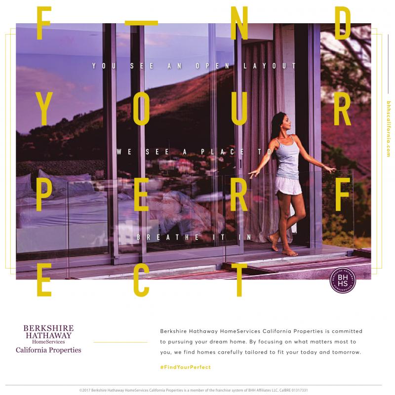 Y O U S E E A N O P E N L A Y O U T W E S E E A P L A C E T O B R E A T H E I T I N Berkshire Hathaway HomeServices California Properties is committed to pursuing your dream home. By focusing on what matters most to you, we find homes carefully tailored to fit your today and tomorrow. #FindYourPerfect ©2017BerkshireHathawayHomeServices California Properties is amember of thefranchise system of BHH AffiliatesLLC.CalBRE01317331
