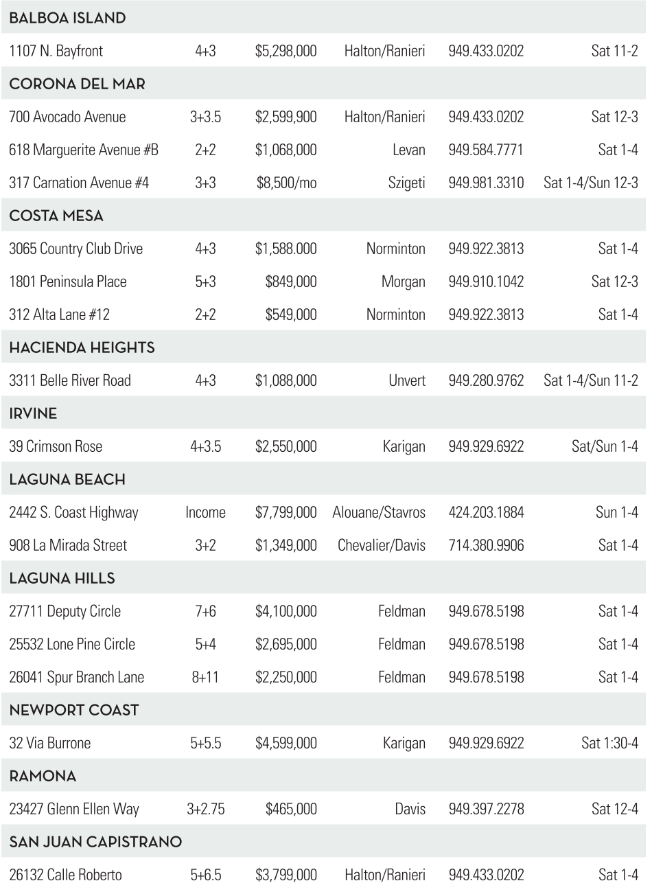 3065 Country Club Drive 4+3 $1,588.000 Norminton 949.922.3813 Sat 1-4 1801 Peninsula Place 5+3 $849,000 Morgan 949.910.1042 Sat 12-3 312 Alta Lane #12 2+2 $549,000 Norminton 949.922.3813 Sat 1-4 HACIENDAHEIGHTS 3311 Belle River Road 4+3 $1,088,000 Unvert 949.280.9762 Sat 1-4/Sun 11-2 IRVINE 39 Crimson Rose 4+3.5 $2,550,000 Karigan 949.929.6922 Sat/Sun 1-4 GUNA BEACH 2442 S. Coast Highway Income $7,799,000 Alouane/Stavros 424.203.1884 Sun 1-4 908 La Mirada Street 3+2 $1,349,000 Chevalier/Davis 714.380.9906 Sat 1-4 GUNA HILLS 27711 Deputy Circle 7+6 $4,100,000 Feldman 949.678.5198 Sat 1-4 25532 Lone Pine Circle 5+4 $2,695,000 Feldman 949.678.5198 Sat 1-4 26041 Spur Branch Lane 8+11 $2,250,000 Feldman 949.678.5198 Sat 1-4