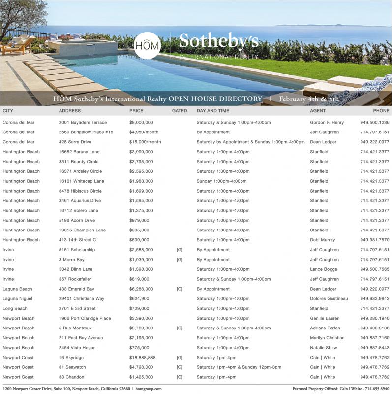 Corona del Mar 2001 Bayadere Terrace $8,000,000 Saturday & Sunday 1:00pm-4:00pm Gordon F. Henry 949.500.1236 Corona del Mar 2569 Bungalow Place #16 $4,950/month By Appointment Jeff Caughren 714.797.6151 Corona del Mar 428 Serra Drive $15,000/month Saturday by Appointment & Sunday 1:00pm-4:00pm Dean Ledger 949.222.0977 Huntington Beach 16652 Baruna Lane $3,999,000 Saturday 1:00pm-4:00pm Stanfield 714.421.3377 Huntington Beach 3311 Bounty Circle $3,795,000 Saturday 1:00pm-4:00pm Stanfield 714.421.3377 Huntington Beach 16371 Ardsley Circle $2,595,000 Saturday 1:00pm-4:00pm Stanfield 714.421.3377 Huntington Beach 16101 Whitecap Lane $1,988,000 Sunday 1:00pm-4:00pm Stanfield 714.421.3377 Huntington Beach 8478 Hibiscus Circle $1,699,000 Saturday 1:00pm-4:00pm Stanfield 714.421.3377 Huntington Beach 3461 Aquarius Drive $1,595,000 Saturday 1:00pm-4:00pm Stanfield 714.421.3377 Huntington Beach 16712 Bolero Lane $1,375,000 Saturday 1:00pm-4:00pm Stanfield 714.421.3377 Huntington Beach 5196 Acorn Drive $979,000 Saturday 1:00pm-4:00pm Stanfield 714.421.3377 Huntington Beach 19315 Champion Lane $905,000 Saturday 1:00pm-4:00pm Stanfield 714.421.3377 Huntington Beach 413 14th Street C $599,000 Saturday 1:00pm-4:00pm Debi Murray 949.981.7570 Irvine 5151 Scholarship $2,588,000 [G] By Appointment Jeff Caughren 714.797.6151 Irvine 3 Morro Bay $1,939,000 [G] By Appointment Jeff Caughren 714.797.6151 Irvine 5342 Blinn Lane $1,398,000 Saturday 1:00pm-4:00pm Lance Boggs 949.500.7565 Irvine 557 Rockefeller $819,000 Saturday & Sunday 1:00pm-4:00pm Jeff Caughren 714.797.6151 Laguna Beach 433 Emerald Bay $6,288,000 [G] By Appointment Dean Ledger 949.222.0977 Laguna Niguel 29401 Christiana Way $624,900 Saturday 1:00pm-4:00pm Dolores Gastineau 949.933.9842 Long Beach 2701 E 3rd Street $729,000 Saturday 1:00pm-4:00pm Stanfield 714.421.3377 Newport Beach 1966 Port Claridge Place $3,390,000 Saturday 1:00pm-4:00pm Genille Lauren 949.280.1940 Newport Beach 5 Rue Montreux $2,789,000 [G] Saturday & Sunday 1:00pm-4:00pm Adriana Farfan 949.400.9136 Newport Beach 211 East Bay Avenue $2,195,000 Saturday 1:00pm-4:00pm Marilyn Christian 949.887.7160 Newport Beach 2454 Vista Hogar $775,000 Saturday 1:00pm-4:00pm Natalie Shaw 949.887.8443 Newport Coast 16 Skyridge $18,888,888 [G] Saturday 1pm-4pm Cain | White 949.478.7762 Newport Coast 31 Seawatch $4,798,000 [G] Saturday 1pm-4pm & Sunday 12pm-3pm Cain | White 949.478.7762 Newport Coast 33 Chandon $1,425,000 [G] Saturday 1pm-4pm Cain | White 949.478.7762