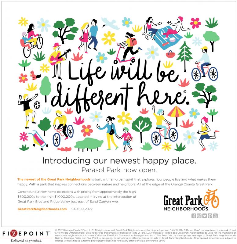 Introducing our newest happy place. Parasol Park now open. The newest of the Great Park Neighborhoods is built with an urban spirit that explores how people live and what makes them happy. With a park that inspires connections between nature and neighbors. All at the edge of the Orange County Great Park. Come tour our new home collections with pricing from approximately the high $500,000s to the high $1,000,000s. Located in Irvine at the intersection of Great Park Blvd and Ridge Valley, just east of Sand Canyon Ave. GreatParkNeighborhoods.com | 949.523.2077 ©2017 Heritage Fields El Toro, LLC. All rights reserved. Great Park Neighborhoods, the bicycle logo, and “Life Will BeDifferent Here” is aregistered trademark of and “Live Will BeDifferent Here” are aregistered trademarks ofHeritage Fields El Toro, LLC (“Heritage Fields”) dba Great Park Neighborhoods used for the marketing of new home neighborhoods in Irvine, California. Five Point Communities Management, Inc. (“Five Point”) is the development manager of Great Park Neighborhoods. Neither Heritage Fields nor Five Point is designing, constructing or offering homes for sale in Great Park Neighborhoods. All proposed amenities are subject to change without notice. Lifestyle photography does not reflect any ethnic or racial preference. (1/17)