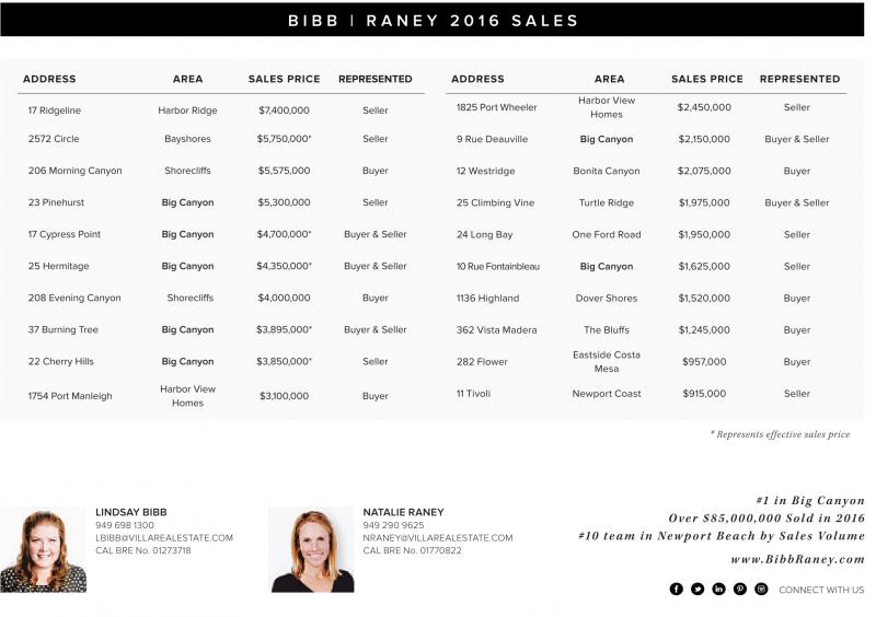 #1 in Big Canyon Over $85,000,000 Sold in 2016 #10 team in Newport Beach by Sales Volume www.BibbRaney.com