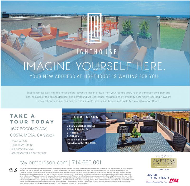 *Taylor Morrison received the highest numerical score in the proprietary Lifestory Research 2016 and 2017 America’sMost Trusted® Home Builder study.The 2016 study based on 39,079 new home shoppers from Jan-Dec 2015, and 2017 study based on 31,764 new home shoppers from Jan-Dec 2016 in the United States. Your experiences may vary.Visit www.lifestoryresearch.com. All community and home information (including, but not limited to prices, views, school assignments and ratings, availability,broker commission programs, incentives, floor plans, site plans, features, standards and options, assessments and fees, planned amenities, programs, conceptual artists’ renderings and community development plans) is not guaranteed and remains subject to changes or delay without notice. Maps and plans are not to scale and all dimensions are approximate. Prices may not include lot premiums, upgrades and options. Community Association or other fees may be required. All homes are subject to prior sale. No Purchase Agreement may be negotiated or signed by aprospective buyer for the purchase of ahome until the Community’sapplicable Conditional or Final Public Report has been issued by the Bureau of Real Estate (CalBRE). Marketing materials do not reflect aracial, age, familial status or ethnic preference. This material shall not constitute avalid offer in any state where prior registration is required or if void by law.Please see aTaylor Morrison Community Sales Manager for details and www.taylormorrison.com for additional disclaimers. Taylor Morrison Services, Inc., BRE #00968975. ©February,2017, Taylor Morrison of California, LLC. All rights reserved.