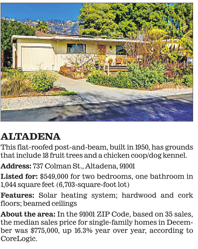 ALTADENA This flat-roofed post-and-beam, built in 1950, has grounds that include 18 fruit trees and a chicken coop/dog kennel. Address: 737 Colman St., Altadena, 91001 Listed for: $549,000 for two bedrooms, one bathroom in 1,044 square feet (6,703-square-foot lot) Features: Solar heating system; hardwood and cork floors; beamed ceilings About the area: In the 91001 ZIP Code, based on 35 sales, the median sales price for single-family homes in December was $775,000, up 16.3% year over year, according to CoreLogic. See also