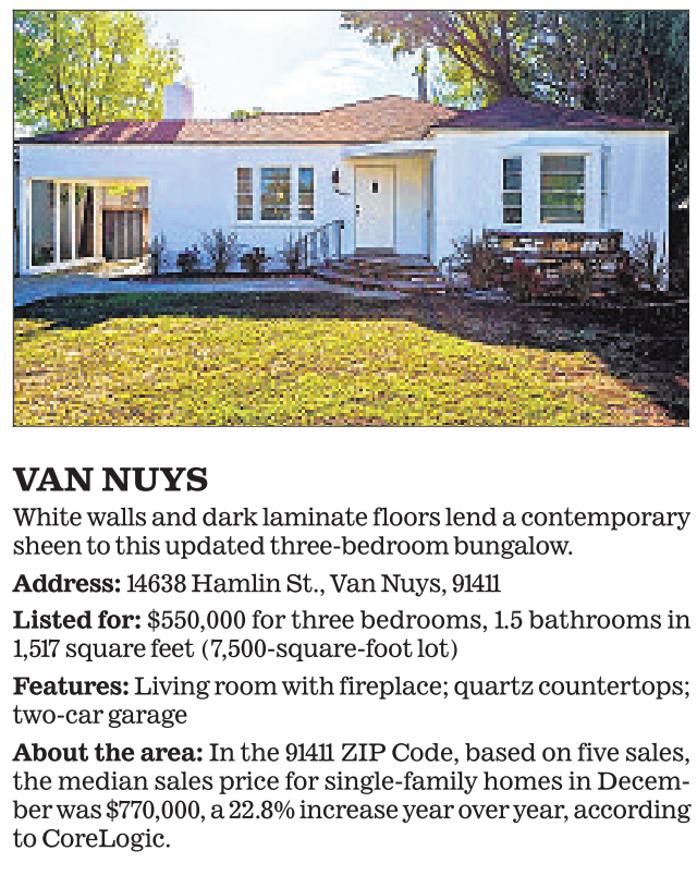 VAN NUYS White walls and dark laminate floors lend a contemporary sheen to this updated three-bedroom bungalow. Address: 14638 Hamlin St., Van Nuys, 91411 Listed for: $550,000 for three bedrooms, 1.5 bathrooms in 1,517 square feet (7,500-square-foot lot) Features: Living room with fireplace; quartz countertops; two-car garage About the area: In the 91411 ZIP Code, based on five sales, the median sales price for single-family homes in December was $770,000, a 22.8% increase year over year, according to CoreLogic. See also
