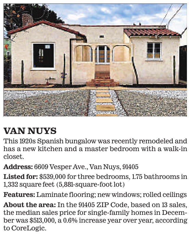 About the area: In the 91405 ZIP Code, based on 13 sales, the median sales price for single-family homes in December was $513,000, a 0.6% increase year over year, according to CoreLogic.