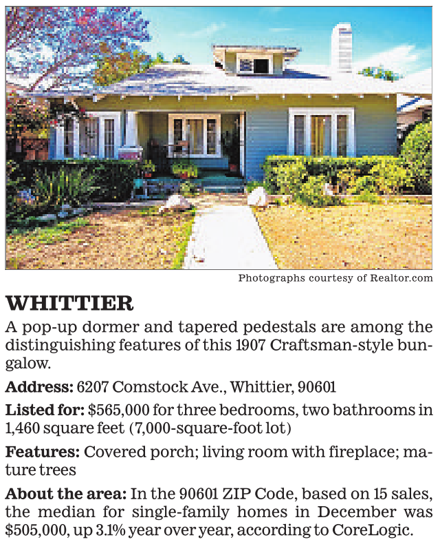 WHITTIER A pop-up dormer and tapered pedestals are among the distinguishing features of this 1907 Craftsman-style bungalow. Address: 6207 Comstock Ave., Whittier, 90601