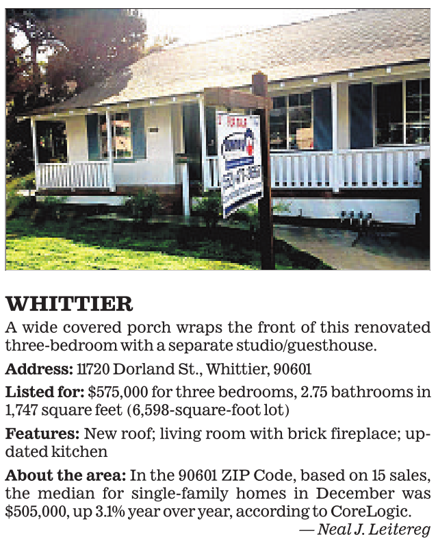 About the area: In the 90601 ZIP Code, based on 15 sales, the median for single-family homes in December was $505,000, up 3.1% year over year, according to CoreLogic.