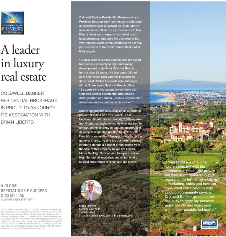 “Brian’s keen business acumen has propelled his success primarily in high-end luxury development projects in Newport Beach for the past 12 years. He has a portfolio of over $30 million built with his investors to date,” said Debbie Lewandowski, manager of the Brokerage’s Newport Beach office. “By combining his executive mentality with Coldwell Banker Residential Brokerage’s distinguished reputation, Brian is positioned to make tremendous strides in his career.”