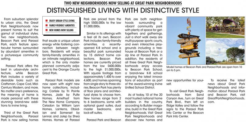 To receive the latest news about Great Park Neighborhoods and information about Parasol Park and Beacon Park, visit GreatParkNeighborhoods. com.