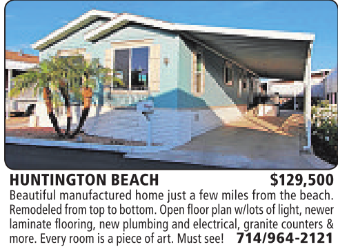 HUNTINGTON BEACH $129,500 Beautiful manufactured home just afew miles from the beach. Remodeledfrom top to bottom. Open floorplanw/lotsoflight,newer laminate flooring, new plumbing and electrical, granite counters & more.Every room is apiece of art. Mustsee! 714/964-2121