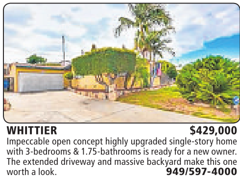 WHITTIER $429,000 Impeccable open concept highly upgraded single-story home with 3-bedrooms&1.75-bathrooms is readyfor anew owner. The extended driveway and massive backyard make this one worthalook. 949/597-4000