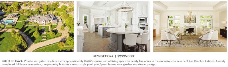 COTO DE CAZA: Private and gated residence with approximately 10,000 square feet of living space on nearly five acres in the exclusive community of Los Ranchos Estates. A newly completed full home renovation, the property features a resort-style pool, pool/guest house, rose garden and six-car garage.