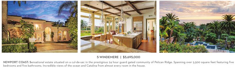 5 WINDEMERE | $5,695,000 NEWPORT COAST: Sensational estate situated on a cul-de-sac in the prestigious 24 hour guard gated community of Pelican Ridge. Spanning over 5,500 square feet featuring five bedrooms and five bathrooms. Incredible views of the ocean and Catalina from almost every room in the house.