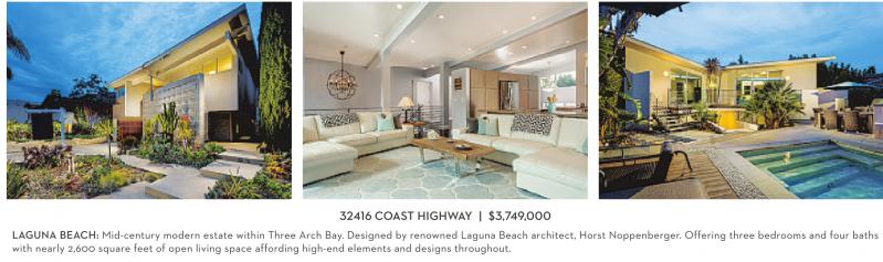 32416 COAST HIGHWAY | $3,749,000 LAGUNA BEACH: Mid-century modern estate within Three Arch Bay. Designed by renowned Laguna Beach architect, Horst Noppenberger. Offering three bedrooms and four baths with nearly 2,600 square feet of open living space affording high-end elements and designs throughout.