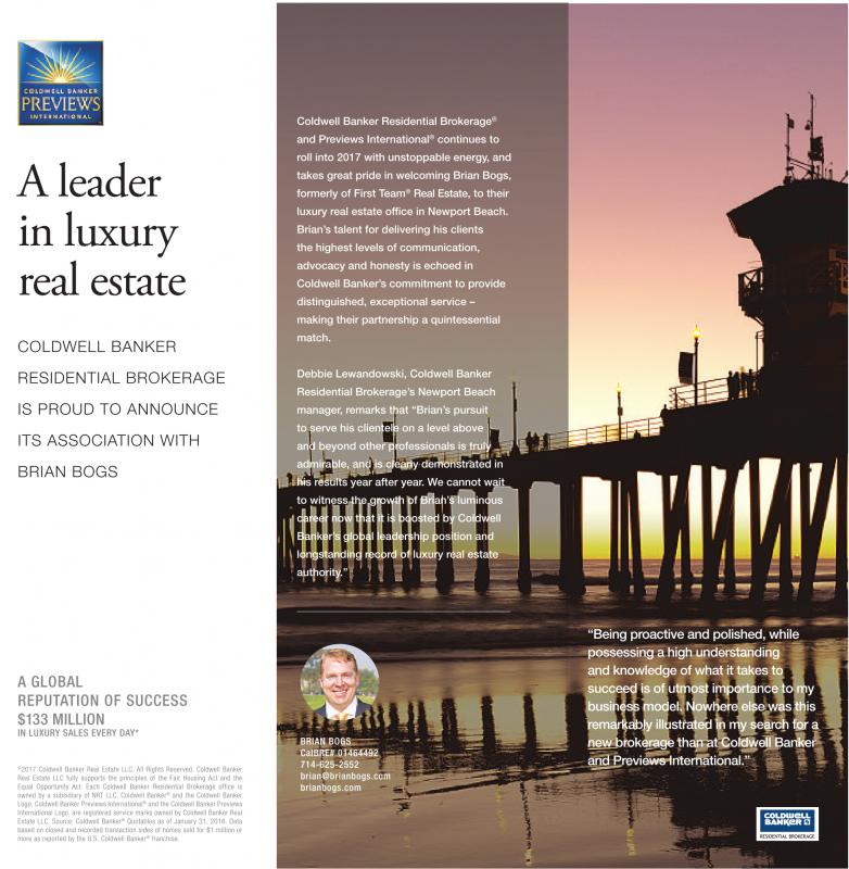 Coldwell Banker Residential Brokerage ® and Previews International ® continues to roll into 2017 with unstoppable energy, and takes great pride in welcoming Brian Bogs, formerly of First Team ® Real Estate, to their luxury real estate office in Newport Beach. Brian’s talent for delivering his clients the highest levels of communication, advocacy and honesty is echoed in Coldwell Banker’s commitment to provide distinguished, exceptional service – making their partnership a quintessential match.