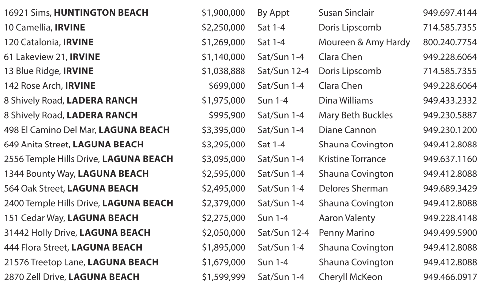 61 Lakeview 21, IRVINE $1,140,000 Sat/Sun 1-4 Clara Chen 949.228.6064 13 Blue Ridge, IRVINE $1,038,888 Sat/Sun 12-4 Doris Lipscomb 714.585.7355 142 Rose Arch, IRVINE $699,000 Sat/Sun 1-4 Clara Chen 949.228.6064 8Shively Road, LADERARANCH $1,975,000 Sun 1-4 Dina Williams 949.433.2332 8Shively Road, LADERARANCH $995,900 Sat/Sun 1-4 MaryBeth Buckles 949.230.5887 498 El Camino Del Mar, LAGUNA BEACH $3,395,000 Sat/Sun 1-4 Diane Cannon 949.230.1200 649Anita Street, LAGUNA BEACH $3,295,000 Sat 1-4 Shauna Covington 949.412.8088 2556 Temple HillsDrive, LAGUNA BEACH $3,095,000 Sat/Sun 1-4 Kristine Torrance 949.637.1160 1344 BountyWay, LAGUNA BEACH $2,595,000 Sat/Sun 1-4 Shauna Covington 949.412.8088 564 OakStreet, LAGUNA BEACH $2,495,000 Sat/Sun 1-4 Delores Sherman 949.689.3429 2400 Temple Hills Drive, LAGUNA BEACH $2,379,000 Sat/Sun 1-4 Shauna Covington 949.412.8088 151 Cedar Way, LAGUNA BEACH $2,275,000 Sun1-4 Aaron Valenty 949.228.4148 31442Holly Drive, LAGUNA BEACH $2,050,000 Sat/Sun 12-4 PennyMarino 949.499.5900 444Flora Street, LAGUNA BEACH $1,895,000 Sat/Sun 1-4 Shauna Covington 949.412.8088 21576Treetop Lane, LAGUNA BEACH $1,679,000 Sun 1-4 Shauna Covington 949.412.8088 2870 Zell Drive, LAGUNA BEACH $1,599,999 Sat/Sun 1-4 Cheryll McKeon 949.466.0917